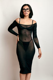 Vestido entubado de mesh con escote en clavículas y manga larga.